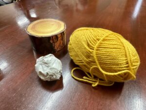 まずは紙を丸めて芯を作って...その上から毛糸をぐるぐる、ぐるぐる...