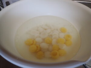 出来たのは月に見立てた黄色のだんごとウサギっぽく白のだんごのお汁粉です。