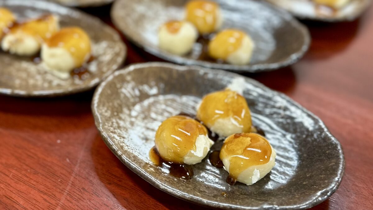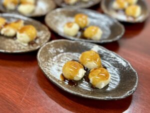 丸めたら、茹でて焼いて...仕上げに甘辛のみたらしあんをとろ~っとかけたら、完成っ!